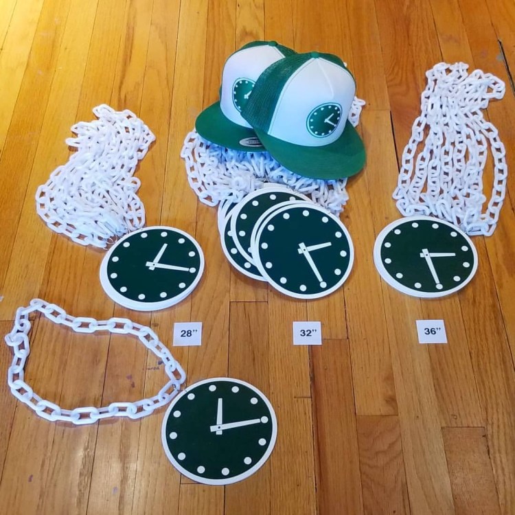 This summer will be the 4th Annual Rosen & Friends Bleacher outing. Every year, I’ve made something for the group to wear. Last year we did Wrigley Clock hats… this year, I’ve made Flavor Flav Clock necklaces!
