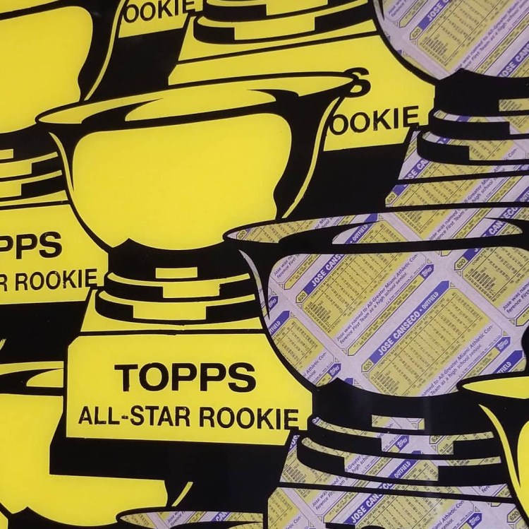 #vintagebaseballcards #topps #rookie #allstarrookie #baseballart #sportsart #baseballcardart #baseballcardartist #popart #josecanseco #1987 #80s #80sstyle #trophy #yellow